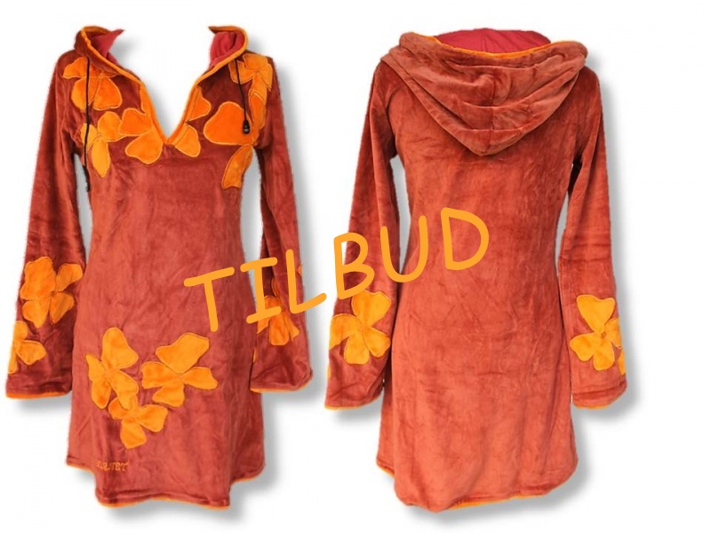 Kjole i 100% bomullsvelour med påsydde applikasjoner og hette med bomullsfôr.