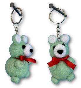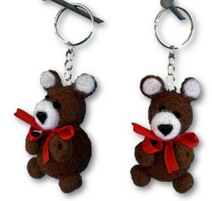 Søte teddybjørner laget av filtkuler. De har røde sløyfer og er godt festet til en nøkkelring. De er ca. 6 cm. høye og 3,5 cm. brede.
