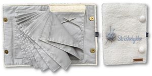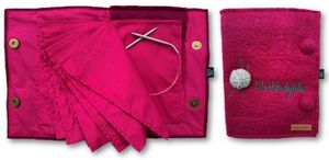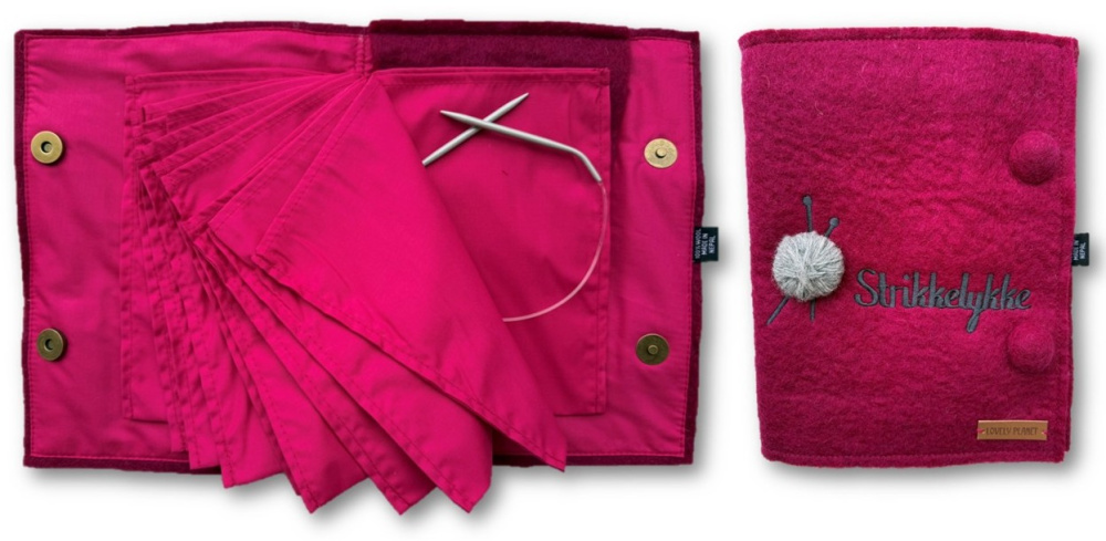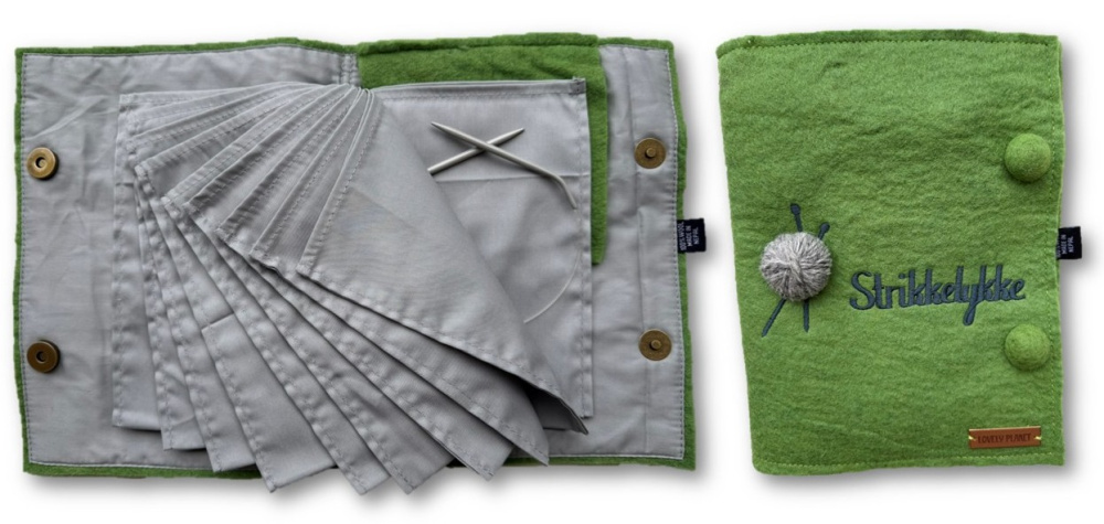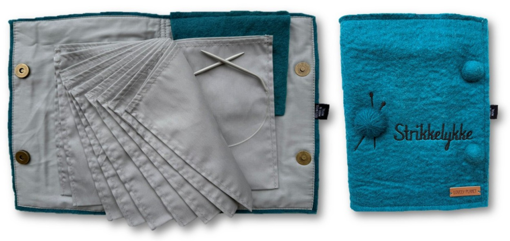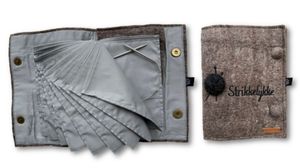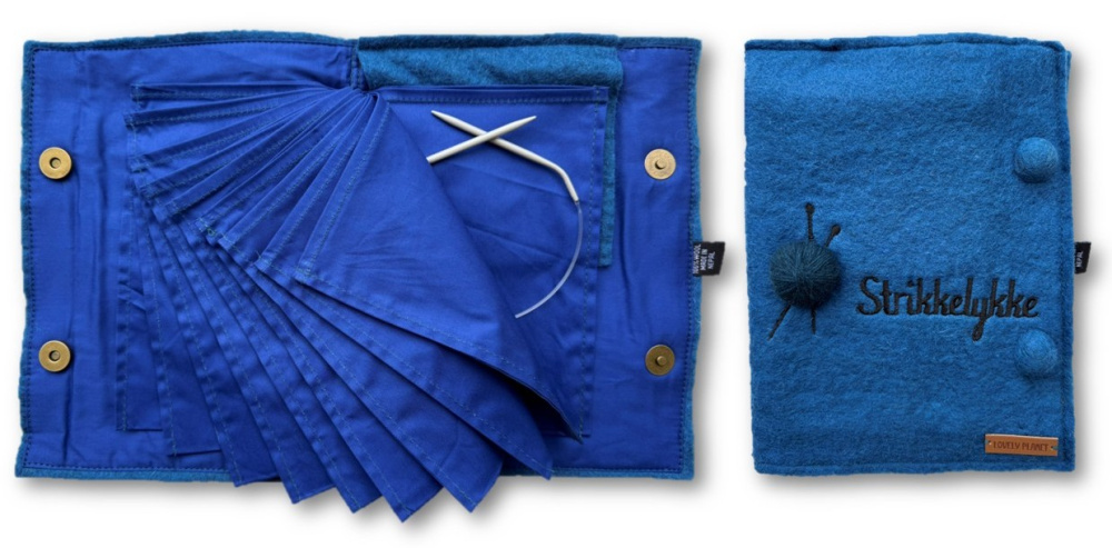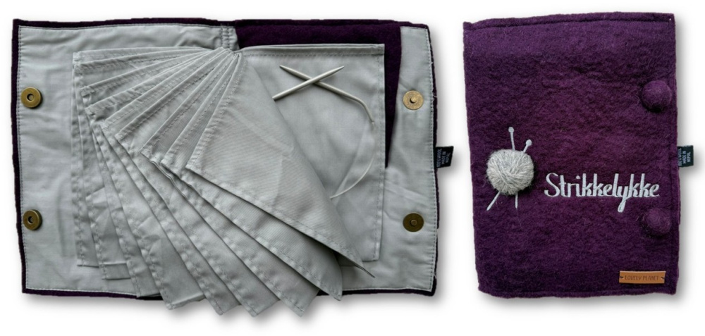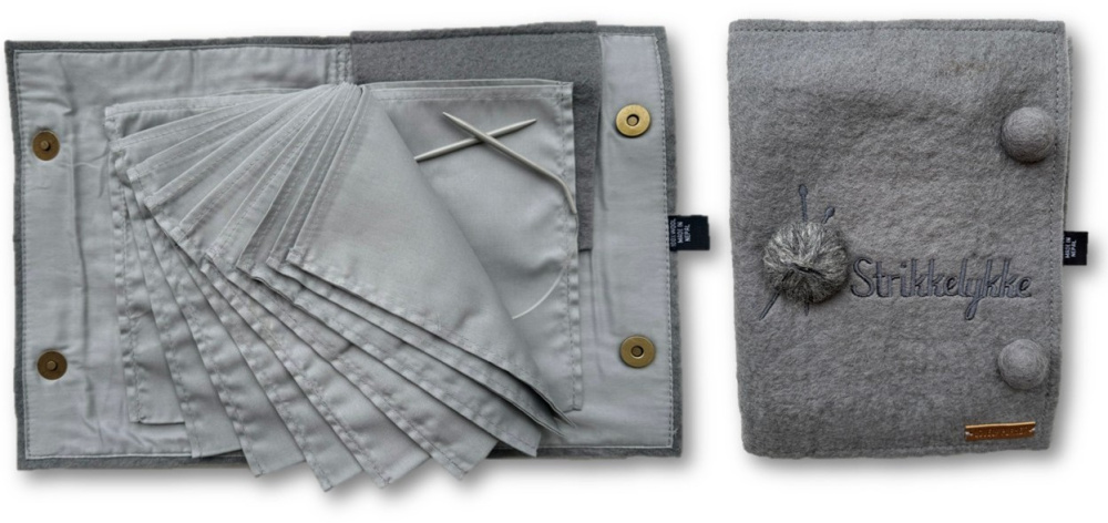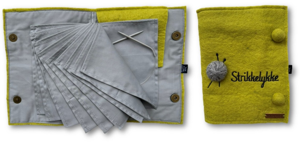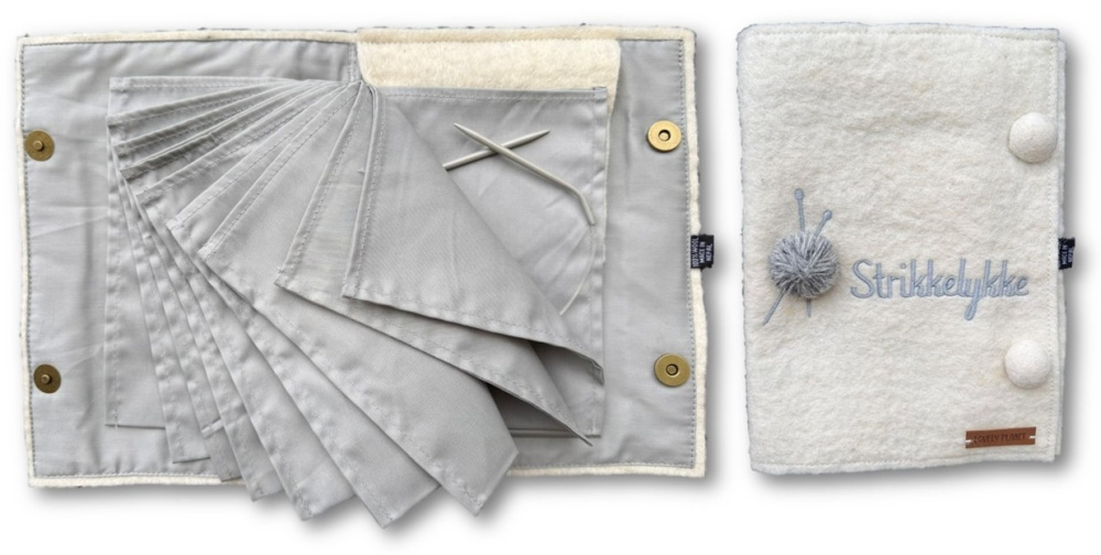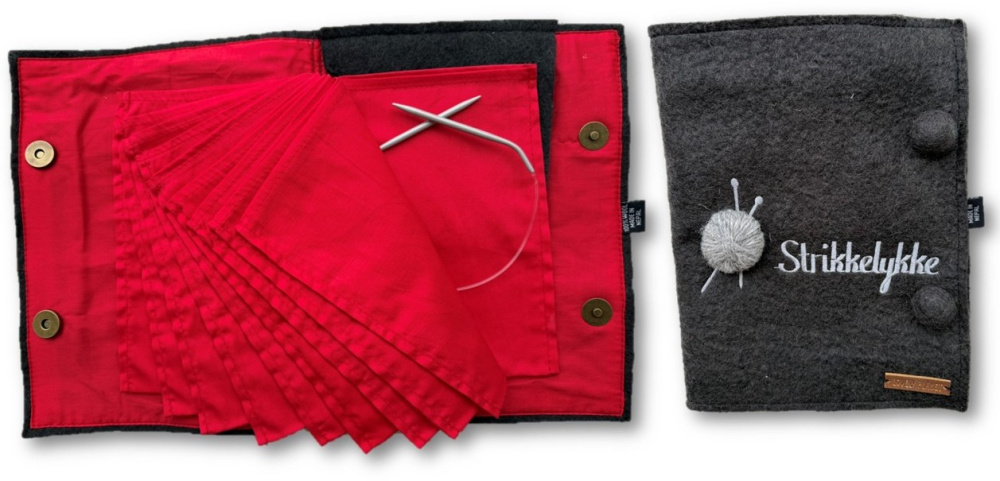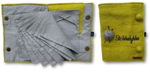 Et praktisk album for oppbevaring av rundpinner som er laget av tovet ullfilt og bomull. Utvendig er det påbrodert teksten "Strikkelykke" og appliker et lite garnnøste.
