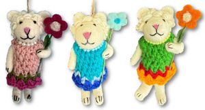 Disse søte sauene har heklede sommerkjoler, og holder en blomst under armen. Rundt halsen har de et matchende perlekjede. De er håndlagde, og er så forseggjorte. Alle har snor for oppheng. Armer og bein kan formes etter ønske, da det er en fleksibel metalltråd inni. Sauene er ca. 11, 5 cm lange, og ca. 4,5 cm. brede.