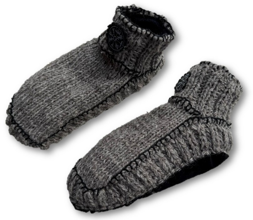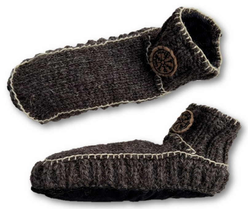 Tøffe håndstrikkede tøfler i ull med skinnsåle. Disse tøflene er enkle og designet med inspirasjon fra vikingtiden. De er ensfarget, men har dekorative kantesting og et brodert lite merke av "vegvisir" sydd på. Dette symboet var vikingenes kompass, og har en fin symbolikk også i dag. Tøflene er fôret med fleece, og finnes i to størrelser, for kvinner og for menn. Akkurat nå er det bare noen få par i damestørrelse på lager. Ca. 15. november kommer det flere votter i begge størrelser på lager.