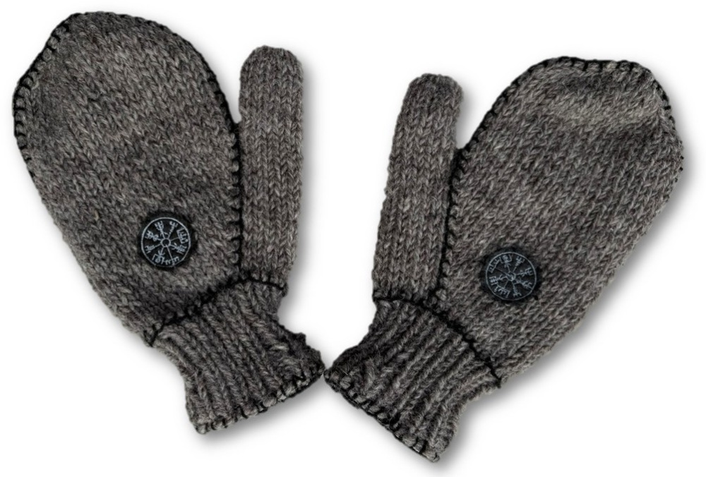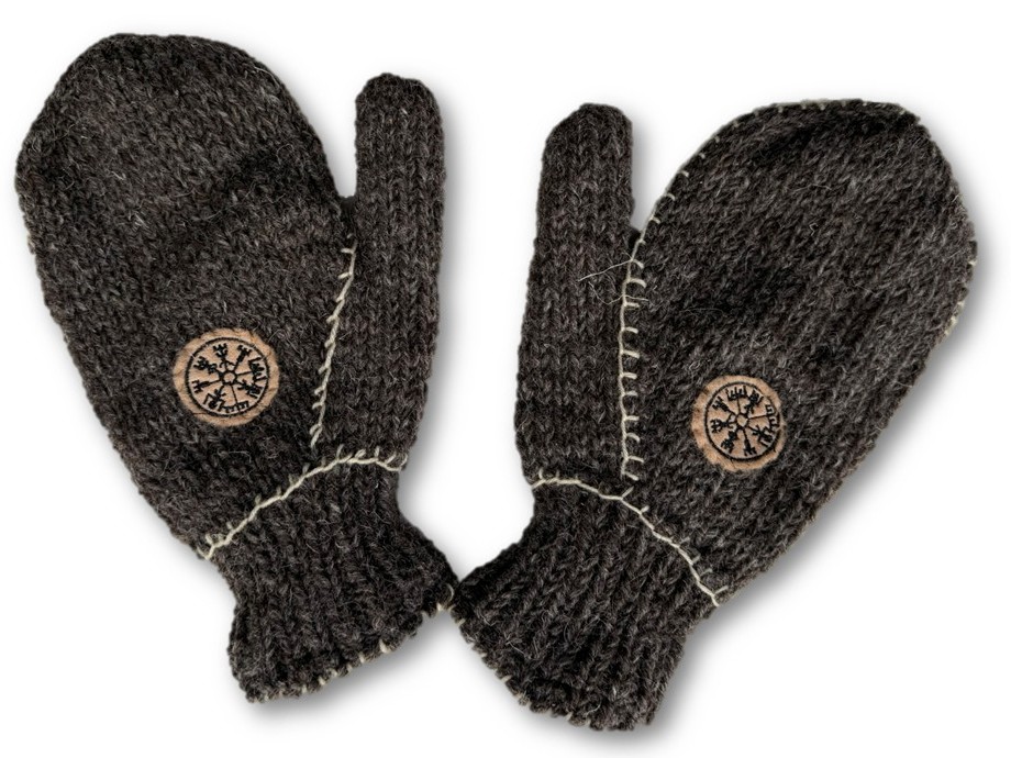 Tøffe håndstrikkede votter i ull. Disse vottene er enkle og designet med inspirasjon fra vikingtiden. De er ensfarget, men har dekorative kantesting og et brodert lite merke av "vegvisir" sydd på. Dette symboet var vikingenes kompass, og har en fin symbolikk også i dag. Vottene er fôret med fleece, og finnes i to størrelser, for kvinner og for menn. Akkurat nå er det bare noen få par i damestørrelse på lager. Ca. 15. november kommer det flere votter i begge størrelser på lager.